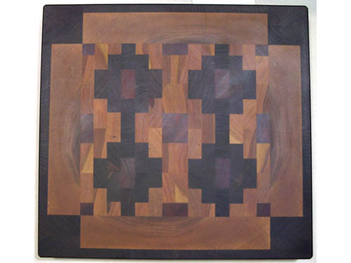 This almost square end grain chopping board is framed by walnut. The edges are bevelled to fit in well with its almost persian inspired design.