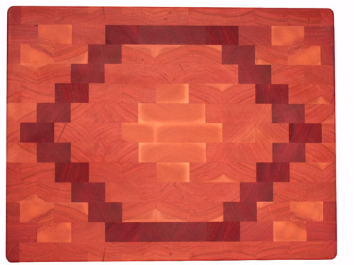 This beautiful end grain butcher block combines Cherry, African Mahagony, and Ash in a Persian inspired design. This hefty board is fully reversible and features recessed handles.