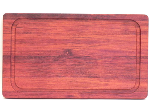Edge grain Jatoba board with juice groove and rounded edges.