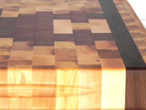 Maple end grain board with a inukshuk standing on a walnut log in water with a cloudy background. Features recessed handles and rounded edges.